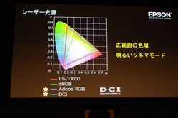 レーザー光源を採用したことで様々なメリットが生まれるが、その一つが色域が広がり、より色鮮やかな映像を実現できることだ。本機で投映できる色域は、DCIを100%カバーするのみならずAdobeRGBも包含している。フル10ビットカラープロセッシングで、約10億7000万色表示が可能(一部12ビット処理)。