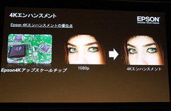 デバイス自体の画素数は1,920×1,080だが、画素ずらし技術を用いることで4K映像の表示に対応。4Kは3,840×2,160と4,096×2,160にそれぞれ対応しており、4K/60p入力(4:2:0)も可能。エプソンとして初の4K対応プロジェクターとなる。