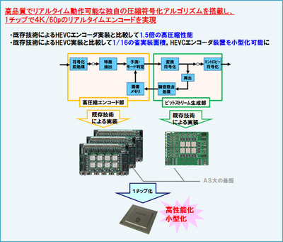 本体は35mm四方のLSIチップで、既存技術によるHEVCエンコーダーと比較し基盤実装面積が16分の1、圧縮性能が1.5倍となり、小型化と高性能化を実現している。