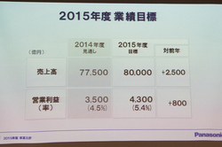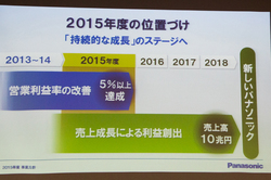 営業利益を達成するためには、売上成長が増益を牽引する構造を実現していく。売上目標については、昨年3月の事業方針説明会より2018年度の売上目標を10兆円と掲げてきたが(関連ニュース)、その道のりとして各年度の売上を2015年度は8兆円、2016年度は8.4兆円、2017年度は9.1兆円と定めた。津賀社長は「10兆円達成への目標を明確にした。1年1年を勝負の年だと考えた決意の数字だ」とコメントしていた。