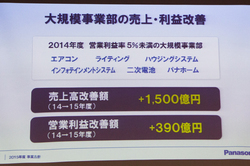 2015年度の業績目標は、売上高8兆円、営業利益4300億円、営業利益率5.4%を目指す。そのために、2014年度に営業利益率5%未満だった6つ大規模事業部の売上・利益改善を行う。該当するのは、エアコン、ライティング、ハウジングシステム、インフォテインメントシステム、二次電池、パナホームの6事業で、いずれも売上が3000億円以上ある6つの事業となる。これら事業部の収益性が改善できれば、全社における収益への貢献度が上げるとし、6事業部合計で2015年度は+1500億円の売上高、+390億円の営業利益(いずれも‘14年度比)の増加を見込んでいる。これを達成すれば6事業部の営業利益率の合計が従来の3%程度から5%へとアップするという。