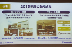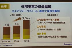 同社の成長を牽引する住宅事業・車載事業についても言及。住宅事業について津賀社長は「当社は家電、設備、そして住宅そのものを併せ持つある意味で唯一の会社」と表現した。新しい暮らしの価値を提供して強みを活かせる事業を展開していく。収益源である国内の住宅設備・サービス事業については強みの物販事業に加えて、“ショートステイ付き”介護サービスなどのエイジフリー事業、リフォーム事業を強化して、事業拡大を行っていく。海外については、ASEAN・台湾における住宅事業に本格的に取り込んでいく。