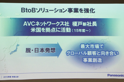2015年度においてはBtoBソリューション事業も全社の柱とし、そのポテンシャルが大きいと考える米国を拠点に活動。AVCネットワークス社の榎戸社長を米国に置き、脱・日本発想によって、グローバルな顧客と密接に関わっていくという。また、M&Aではないについても北米基軸で行うとした。