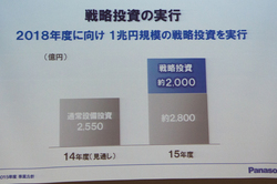 最後に、2018年度に向け、1兆円規模の戦略投資を実行していくことも発表された。2014年度は2550億の通常設備投資を行ったが、2015年度では通常設備投資を約2800億円、戦略投資を約2000億円行う見通しとした。津賀社長は「大規模投資によって結果的に減損に至った過去を反省し、メリハリを付けて戦略的に投資を行う」と述べた。