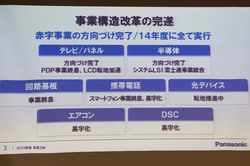 構造改革については、赤字7事業の構造改革の方向付けが完了。2014年度は未だ赤字が残る事業もあるものの、黒字化への道筋を付け終えたという意味で、「中期における事業構造改革は完遂したと認識している」とした。また、家電を取り扱う社内カンパニーであるアプライアンス社の傘下にテレビ事業部を新設することも発表。テレビ事業における日本・欧州・アジア・中南米の4地域に集中した商品力強化と地域完結体制の構築による再成長に向け、「ホームエンターテイメント事業部」からテレビ事業関連の機能を移管。テレビ事業に最適な体制を構築していくという。