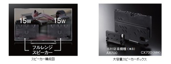 サウンド面では、新開発の「ダイナミックサウンドシステム」を搭載。本システムは従来モデル比で、55型で10倍、50型・40型で6倍の容量を備えるスピーカーボックスを採用することで、歪みを抑えた豊かな低音を再生することができるという。さらに最大出力30W(総合)のアンプを採用することで、臨場感のあるサウンドを可能とした。スピーカーはフルレンジユニット2個を搭載している。