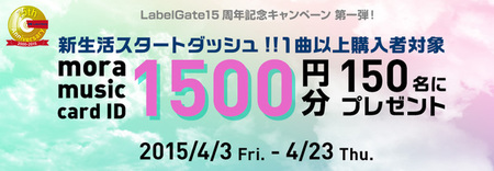 (株)レーベルゲートは、同社の創立15周年を記念して、音楽配信サイト「mora」において15週に渡るプレゼントキャンペーンを本日より実施する。プレゼント内容の総額は、創立15周年にちなみ約150万円になるという。