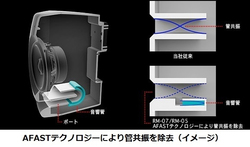 筐体内部とバスレフポート部には、音響管を使って音のこもる原因となる定在波のみを抑制する独自の特許技術「AFASTテクノロジー」を採用。内部の吸音材を大幅に削減することができるため、内部容積を減らさずに定在波を抑制できるのがメリット。ポート部の管共振も除去できるという。