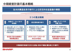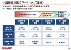 中期経営計画は、2017年度に売上げ3兆円、営業利益1,200億円をめざす意欲的な計画となっている。ただし純利益については、2015年度は構造改革が継続するため、2016年度に黒字化し、2017年度に黒字拡大することをロードマップとして掲げている。