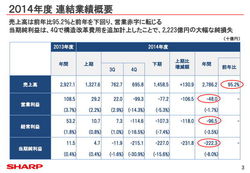 既報の通り、シャープ(株)は、2014年度の通期連結業績を発表した。売上高は約2兆7,863億円で、営業損失は約481億円、純損失は約2,223億円と、いずれも今年2月に発表した予想値を大幅に下回った。