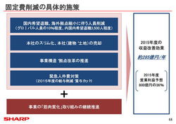 そのほかのリストラ策では、本社のスリム化を行うほか、大阪・阿倍野にある本社の建物・土地の売却も実施。さらに事業構造・拠点改革の推進、'15年度の給与削減・賞与カットなどもあわせて行い、2015年度の収益改善効果として約285億円/年を見込む。