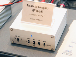 Umbrella Company/GRACE designのブースでは、Umbrella Companyブランドから、MM/MC対応のフォノイコライザー試作機「VINYL-103」を参考出展している。発売時期や価格等は未定。
