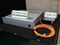 そして、ロンドン五輪やサッカーブラジルW杯などでも使用されたデュアルグリーンカメラや、単板カメラなどで不足する色画素情報を周辺画素から補間するデモザイキング装置、ハイビジョンの約100倍のデータ量にもなる8K映像信号を1本のケーブルで伝送できるインターフェース「U-SDI(Ultrahigh-definition Signal/Data interface)」など、8Kコンテンツを制作するためのハード面を紹介。U-DSIでは、新たに22.2マルチチャンネル音声多重装置を開発し、番組制作に必要な映像と音声信号を一度に伝送できるようになったという。