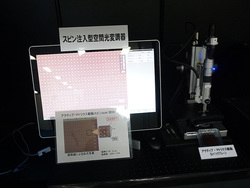これとは別のアプローチによる裸眼3Dとして、ホログラフィーによる立体テレビを目指し、光の状態(強度や位相など)を制御できる微小な光変調素子を2次元アレー配置した空間光変調器を研究。今回、アクティブマトリクス駆動方式に対応した、低電流で動作する挟画素ピッチのスピン注入型空間光変調器を開発したことを紹介。昨年の5μmから2μmへと画素ピッチを40%狭めているという。