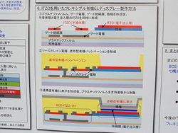 パネルのみの展示となるが、「IGZO」ではなく「ITZO(In-Sn(Tin)-Zn-O)」を用いたフレキシブル有機ELディスプレイの製作技術説明も披露。IGZOにおけるガリウムの代わりにスズ(Sn/Tin)を使うことで、IGZOを超える移動度を実現したという。