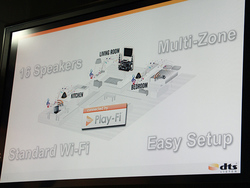 DTS Play-Fiは、簡単にいえばスマートフォンなどのデバイスを使って、端末内の音楽ファイルをマルチルームの各スピーカーにWi-Fi経由でワイヤレス送信できる技術。2013年のCESで発表され、既に米国では提供開始されているが、日本では未展開のサービスとなる。国内で具体的なデモンストレーションが行われたのは、今回の展示会が初めて。