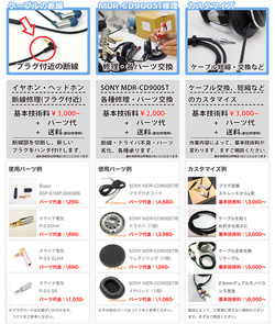 同社ではこれまでもヘッドホン/イヤホンの修理やカスタマイズを行ってきたが、多様化するカスタマイズの要望などに対応するためにメニューを体系化したと説明。例えばケーブルの断線修理(プラグ付近)であれば、基本技術料3,000円にパーツ代と送料という料金で、パーツについてもメーカー別の価格例を提示するなどしている。