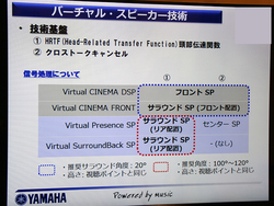 前述の通り、上位モデルのRX-V579だけが搭載する機能として、「バーチャル・サラウンドバックスピーカー」に新しく対応した点がポイントとなる。これは、サラウンドスピーカーから仮想のサラウンドバックスピーカーの音を創生する技術。6.1ch以上のコンテンツを5.1ch環境で再生する場合に、元々の音声信号に含まれるサラウンドバックの音を5.1ch環境で再現できるものになる。例えば「7.1ch音声収録のソフトを5.1ch環境で再生する」といったような場合に有効な機能となる。バーチャル音場の生成には、HRTF解析を用いている。