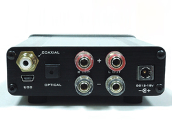 【SPEC】●定格出力:15W+15W(4Ω/DC12V入力時) ●対応スピーカー:4〜16Ω ●入力端子:USB(miniB)、TOS-Link(角形光)、RCA同軸デジタル ●外形寸法:97W×37H×122Dmm(突起部含まず)