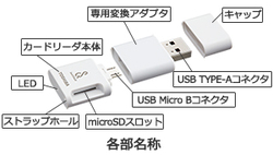 付属品として「SeeQVault対応microSDカードリーダー」を同梱。カードリーダー本体はUSB microBコネクタを搭載し、USB TYPE-Aコネクタへの専用変換アダプタを標準装備する。インターフェースはUSB2.0。