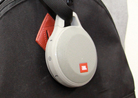 その上で耐久性や耐水性も確保しており、IPX 7の耐水性を備えて、落下や液体のこぼれ、衝撃などに強い。背面には伸縮性と耐水性のあるケーブルストラップ(同社ではバンジーコードと呼称)を備え、バッグや自転車、お風呂場のフックなど様々な場所に取り付けられる。