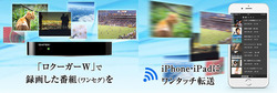 番組の転送は、ロクーガーWとiPhone/iPadをWi-Fiで接続し、表示されたロクーガーW内の録画番組リストから見たい番組をワンタッチするだけ。コンテンツやネットワーク状況にもよるが1時間番組を約30秒で転送できるという。
