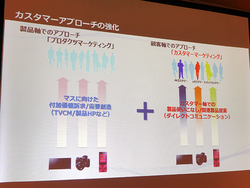 浅山氏は、製品のマーケティングを行う上でソニーではマスに向けた製品CMや公式サイト情報など製品を軸した「プロダクツマーケティング」に加え、顧客とのダイレクトリレーションを軸とした「カスタマーマーケティング」も行っていると説明。“ソニーファンの創造”がソニーマーケティングの使命であり、その実現のために全社を挙げてカスタマーマーケティングに取り組んでいるとする。