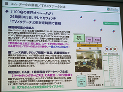 テレビ番組やCMのデータ調査を行う(株)エム・データは、業界関係者向けのイベント「新世紀テレビ大学」を開催。同社が調査しているテレビのメタデータがどのように活用されているのかなどを紹介するとともに、hulu船越雅史氏とdTVの村本理恵子氏との対談などを行った。