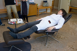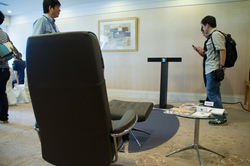 ブースではこのようなAK T1のキャラクターを伝えるべく、ブースに“ストレスレスチェア”で知られるエコーネス社のチェア「Stressless Metro」を用意。実際にこのStressless MetroでくつろぎながらAK T1のサウンドを味わえるスペースが設けられた。人間工学に基づいたストレスレスチェアの座り心地を体験することも可能だった。