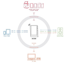 本アプリをインストールすることで、スマホ/タブレットからAK380などのリモートコントロールが可能になる他、DLNA対応機器内のコンテンツのストリーミング再生はもちろん、スマートフォンやタブレット内のコンテンツをAK380でストリーミング再生することも可能となる。
