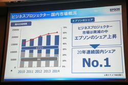 製品ラインナップのほか、エプソンがビジネスプロジェクター市場において、20年連続で国内販売台数シェアNo.1を達成したことも発表された。また、世界シェアについては、14年連続でNo.1だという。