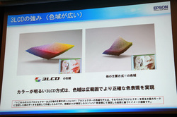 会場では3LCD方式のプロジェクターとDLP方式のプロジェクターを比較するデモンストレーションが行われた。3LCD方式のプロジェクターはエプソンの「EB-W420」で、明るさが全白・カラー3000lm、解像度はWXGA。DLP方式のプロジェクターは他社製で、明るさが全白3200lm、カラー非公開、解像度はWXGA。明るさにはっきりとした違いが表れることを紹介していた。その他、エプソン製および他社製プロジェクターの色域を視覚化した模型も展示されていた。