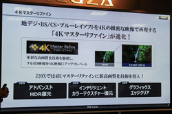 4Kマスターリファインでは、撮影するカメラによって異なる高輝度領域の圧縮特性を高精度に推定して復元し、明るく輝くシーンの中の白い部分を立体的に再現するという「アドバンスドHDR復元」、彩度に合わせて輝度の高域成分を補正して色の濃い映像も細部の質感まで鮮やかに再現し、高彩度のテクスチャーをより精細に表現する「インテリジェントカラーテクスチャー復元」、テロップなどの文字周りのノイズを抑えて滑らかに再現する「グラフィックスエッジクリア」といった技術を搭載。