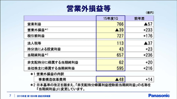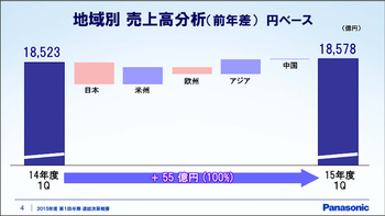 パナソニックは、2015年度第1四半期(2015年4月1日〜2015年6月30日)の連結決算概要を発表した。売上高は1兆8,578億円で前年並み、営業利益は766億円で減益となったが、純利益は595億円で増益となった。