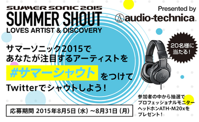 「SUMMER SHOUT (夏を叫べ)」をコンセプトに、サマソニを「参加する」「読む」「知る」の3つの観点から楽しめるというスペシャルサイト。ハッシュタグ(#サマーシャウト)を付けてサマーソニック出演の注目アーティストをTwitterでつぶやいた中から、抽選で20名に同社製ヘッドホン「ATH-M20x」が当たるキャンペーンを実施している。Twitterの投稿受付期間は2015年8月5日(水)〜8月31日(月)で、投稿受付期間後もサイト自体の閲覧は可能。