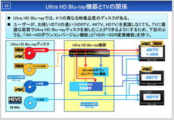 解像度とHDRの有無により、Ultra HD Blu-rayは「4K/HDR」「4K/SDR」「HD/HDR」「HD/SDR」の、4種類の映像コンテンツを収録できる。このため、ユーザーが手持ちのテレビの仕様を意識しなくても最適な画質でUltra HD Blu-rayを視聴できるよう、4K→HDダウンコンバート機能、HDR→SDR変換機能がプレーヤーに搭載される。