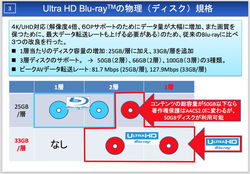 Ultra HD Blu-rayの物理的なディスク仕様は、1層当たりのディスク容量に25GB/層と33GB/層の2種類が用意される。50GB(2層)、66GB(2層)、100GB(3層)の3種類のディスクがありうるということだ。3層については既に日本市場向けに採用されている記録型メディアのBDXLの採用例もある方式だ。