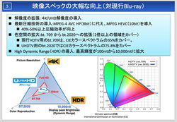 収録する映像フォーマットについては、現行BDと比較すると「解像度」「色域」、そして「輝度レンジ」(HDR)と3つの要素すべてが拡張される。