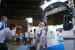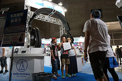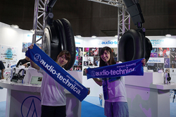 今年のブースでまず目をひくのは、細部まで作り込まれた巨大な「ATH-M50x」のオブジェ! この下で、毎年恒例の名物企画・写真撮影でヘッドホンが当たる大抽選会が行われている。