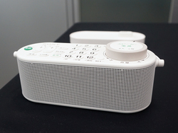 例えば家族がリビングで見ているテレビを少し離れたキッチンで一緒に見る場合などに、そのテレビ音声を手元で確認できるようにするワイヤレススピーカー。テレビ側に接続する送信機とスピーカー本体とのセット構成で、送信機は充電用クレードルも兼ねている。