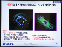 仕様面の大きな進化点としては、ドルビーアトモスとDTS:Xのオブジェクト音声規格に対応。DTS:Xの方は、発売後のファームウェアアップデートでサポート予定としている。さらに、フラグシップ機の特徴として、これらのオブジェクト音声を同社独自の音場創生技術「シネマDSP」と掛け合わせた上で音場を作ることができる。