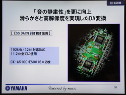 DACは従来モデルと同じく、ESS Sabre 32bit ultra DAC「ES9016」を2基搭載。「音の静粛性」をさらに向上させ、滑らかさと解像度を高めたD/A変換を図っている。DACのデジタルフィルターは「シャープロールオフ」「スローロールオフ」、ヤマハオリジナルの「ショートレイテンシー」の3種類を揃えている。
