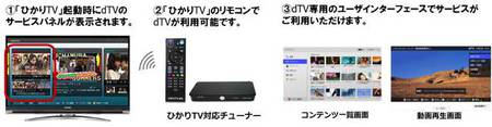 利用開始方法は、ひかりTVを起動後、ホーム画面に表示されるdTVパネルを選択し、docomo IDとパスワードを入力する。入力は初回利用時のみで2回目からは不要。