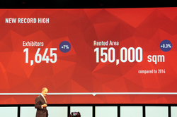 「これまでも変わっていない点」としては、イノベーションや製品の発表の場として非常に強い力を持っていることを強調。「変わった(進化した)点」としては、取り扱われる製品が進化し、コネクティビティやテレコミュニケーション分野のほか、ウェアラブルやソフトウェア、スタートアップ等にとっても重要な場となっていることを紹介。さらに、ショーとしての規模も年々拡大しており、昨年は出展社1,645社(+7%)、出展面積は15万m2にものぼったとの実績をアピールした。