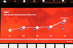 冒頭、ドイツ民生通信エレクトロニクス協会(gfu)のHans-Joachim Kamp氏が登壇し、グローバル市場の状況について説明。製品販売金額は昨年から大きく伸び、今年は891億ユーロに到達すると予測。昨年からの伸び幅が大きいのは中東&アフリカとアジア新興国、北米だという。