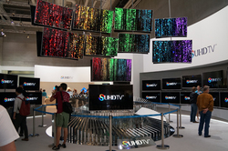 サムスンのIFA2015の展示テーマは「IoT(Internet of Things)」。昨年のIFAで堂々と立ち上げた4KテレビのSUHDシリーズは、今年はブースの中央にはなく、展示面積は小さくはないものの、あくまでサムスンが考えるIoTのコネクテッドデバイスの一つとして、やや大人しめなトーンで並べられていた。ただしプレスカンファレンスでも宣言されたように、サムスンは今後4K/HDRにますます力を入れて取り組んでいく。薄型テレビは上位ラインナップを中心にHDR対応にアップデートしていくほか、ヨーロッパではすっかりハイエンドの薄型テレビとして定着しつつある曲面ディスプレイを搭載する「Curved TV」も、サムスンのSUHDは48インチから最大105インチまで品揃えを強化していく。