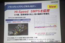 デジタル回路用の電源には、最大3倍の高速駆動を行うスイッチング電源「Hi-Speed SMPS」を採用。アナログ回路とデジタル回路の電源は音質を考慮して分離されているが、特にデジタル回路用のスイッチング電源から発生するノイズに着目。スイッチング周波数がAVR-X4100Wでは33kHz〜66kHzだったのを、AVR-X4200Wでは90kHz〜132kHzまで上げることで、発生するノイズをオーディオ帯域外に追い出し、S/N感、空間表現の向上や音の輪郭の明確化に成功した。