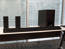 本機は、センタースピーカーと左右のフロントスピーカー2基を備えたバースピーカー1台、リアスピーカー2台、サブウーファー1台から構成されたリアル5.1chシステム。すべてのスピーカーユニット間をワイヤレス接続することにより、スピーカーケーブルを使用することなく5.1chシステムを構築する。