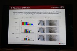 今回のIFA会場にて、LGディスプレイが用意したデモ映像を使い、RGB方式とRGBW方式の比較、さらにRGBW方式のパネルで「RGBのみで表示した映像」と「RGBWのホワイトを利用した映像」も見比べた。比較すると、ハイライトの突き上げによる鮮鋭感の向上を確認できた。イメージとしては、ちょうど超解像を働かせたときに鮮明さが向上するような高画質化効果だ。