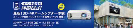 エプソンは、「最新!3D・4Kホームシアター体験イベント」と題した、同社のプロジェクターや150型などの大画面を使用したイベントを、iTSCOM STUDIO & HALL 二子玉川ライズにて10月30日から11月3日まで開催する。入場は無料。